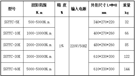 從基本功能與核心參數來看,該便攜式液壓力矩扳手測試儀定位清晰:產品名稱為 “數顯扭矩測試儀",型號以 “SGYYC-" 為基礎標識;在準確度方面,滿量程的 10%~100% 范圍內精度達 1 級,能精準捕捉液壓扳手的扭矩數據,為評估液壓扳手性能、避免因扭矩偏差引發的設備安全隱患提供可靠依據。
